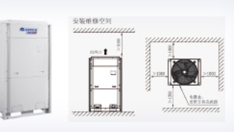 3.室外机是散热设备,务必确保安装位置通风流畅。以免影响使用效果。要求出风无障碍,如周围空间为开放空间,机组顶部距顶墙1500mm以上;如非开放空间,或距顶墙不足1500mm,需接回风管。