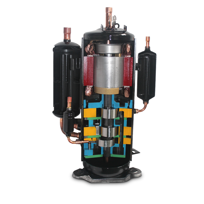 三缸双级变容积比压缩机可实现两 种不同容积比的双级压缩,可降低单个气缸的压缩比,减小了 泄漏量,提高了压缩机的容积效率,与单级压缩系统相比,双 级增焓压缩系统具有能力高、能效高和可靠性高的优势,使用 在家用热泵空调、多联式热泵空调、户用冷水热泵机组等多种 类型的热泵产品中。