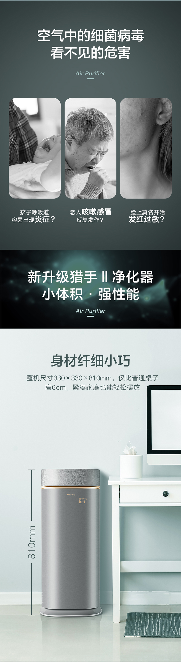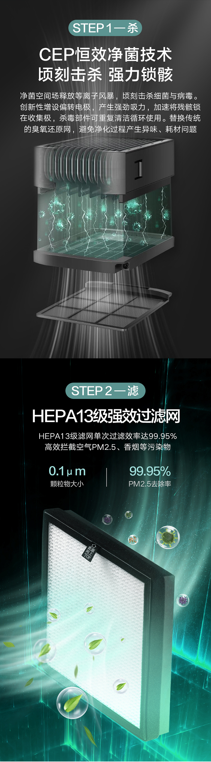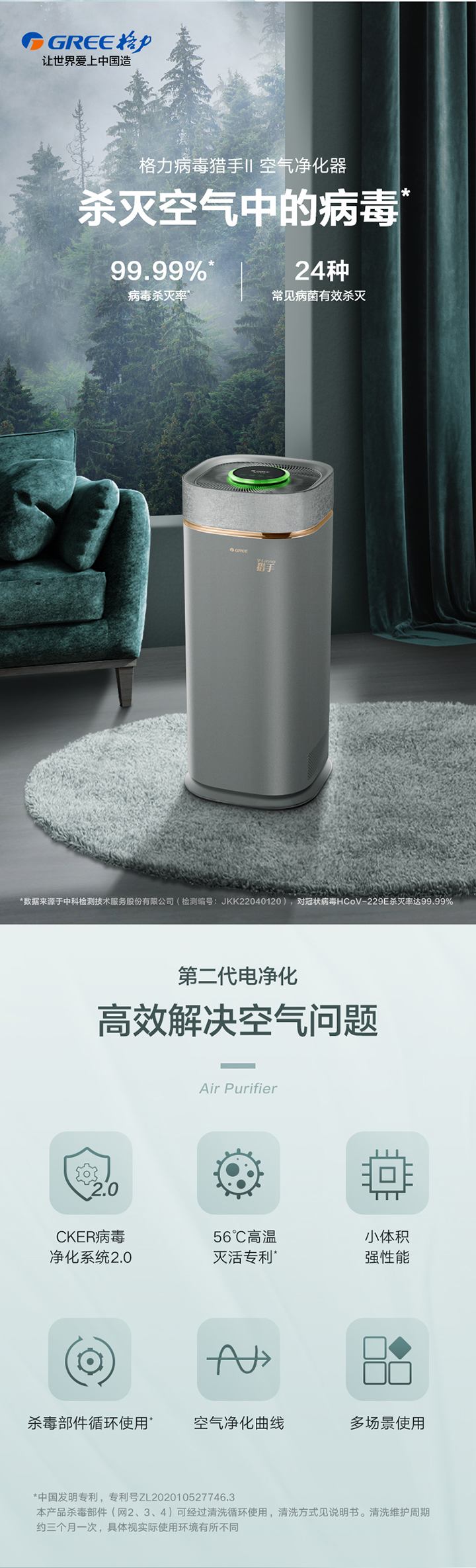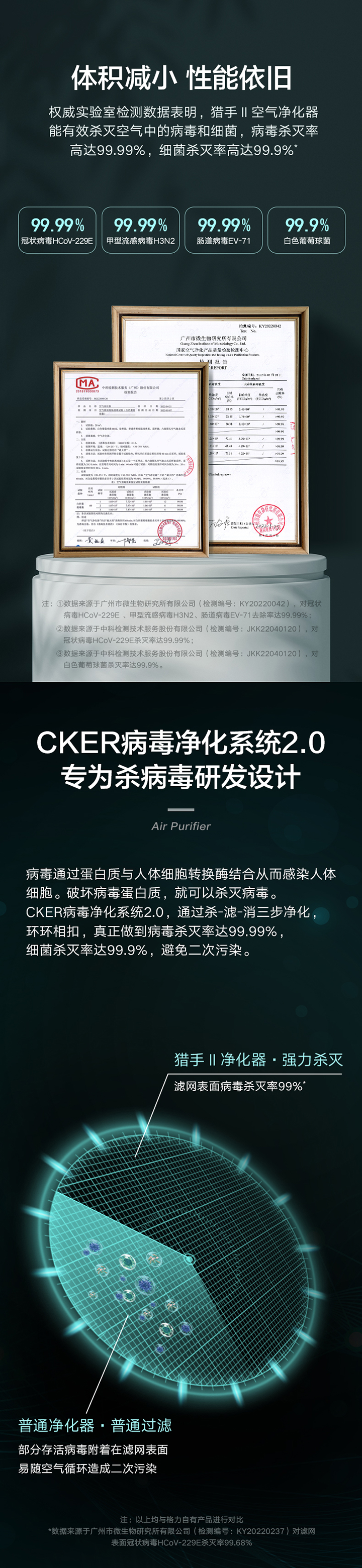 猎手II空气净化器体积减小,但性能依旧强悍,通过CKER病毒净化系统2.0,真正做到病毒杀灭率达99.99%,细菌杀灭率达99.9%